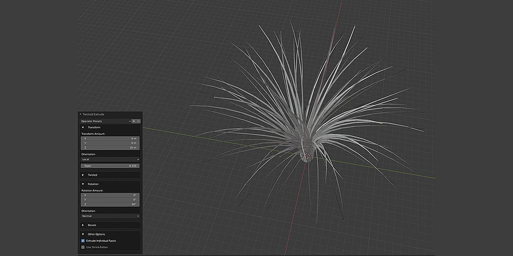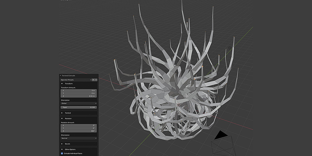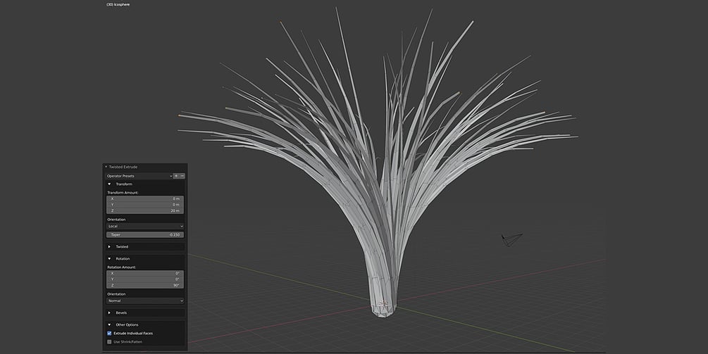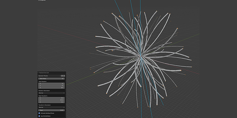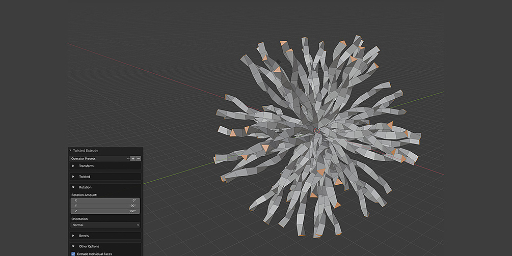 Create a twisted extrusion effect that is useful for quickly creating curled geometry like pipes, tendrils, or more abstract effects. Creating curved extrusions: Get interesting effects on shapes like the Ico Sphere with the Extrude Individual Faces option
